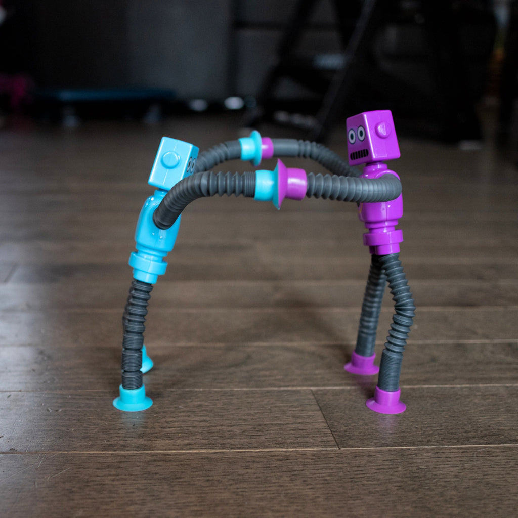 My autistic son is in his 30's..I have always looked for sensory-stimulating and calming gadgets for him. He is actively engaged with this robot toy as he can stretch the arms and legs out and gets satisfaction from the sound that makes. It helps him with his Occupational Therapy in that he uses his hands to push and pull the arms + legs and presses the suction ends together then pulls them apart. I am so glad I bought 5 because he can link them together then pull them apart!