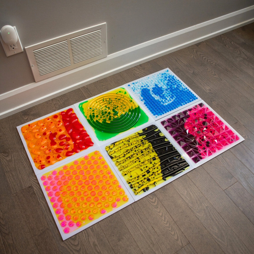 Transform any space into a galactic sensory adventure with Nebula Liquid Floor Tiles! These 12” x 12” textured tiles are filled with vibrant, swirling liquid and feature unique tactile patterns that provide soothing sensory feedback with every step, press, or touch.