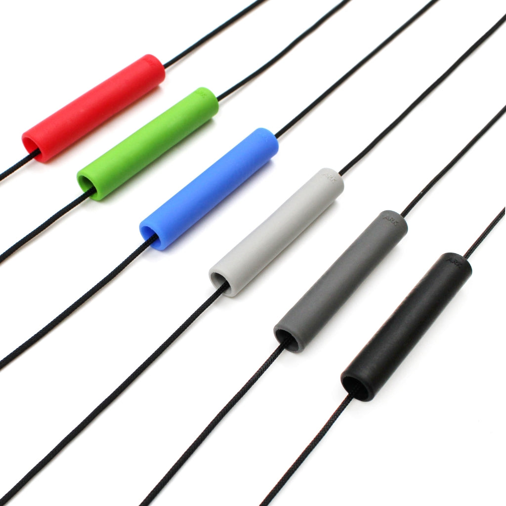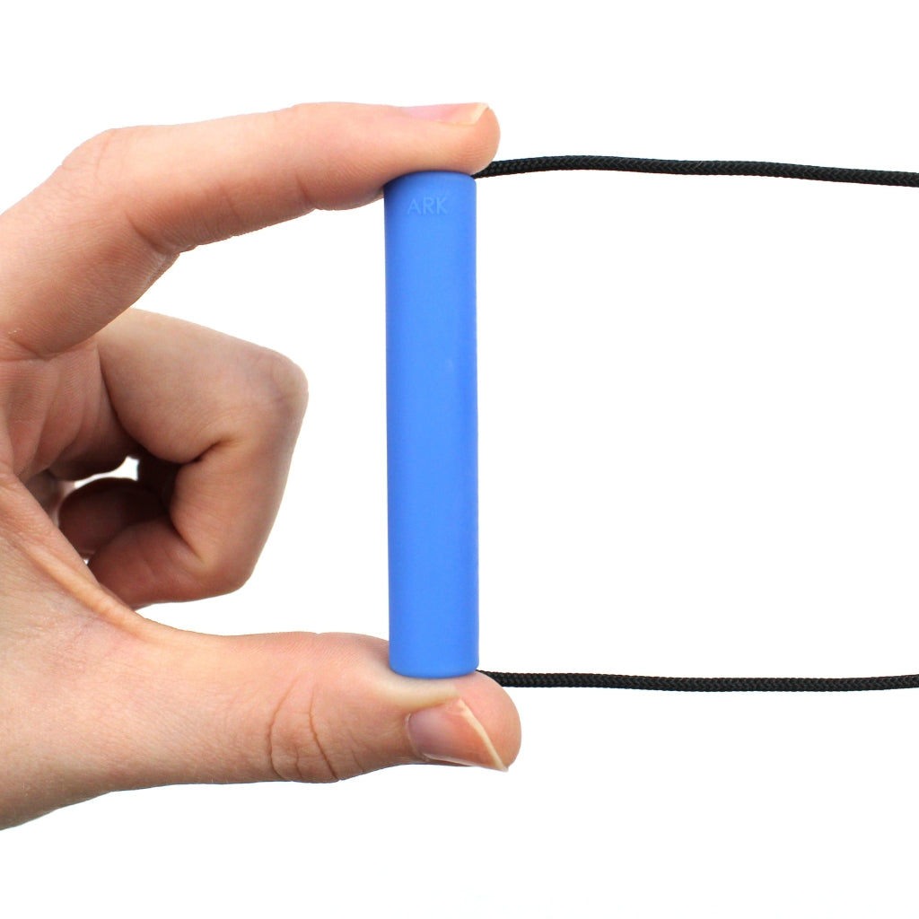 ARK’s Chewlinder™ Necklace is unique in that instead of hanging vertically, this tube necklace hangs horizontally. In other words, the string goes through the whole pendant instead of just through the top. Use this cylinder-shaped chew pendant as a safe and discreet solution for anyone who needs to chew. The tube pendant is a great "chewelry" (chewable jewelry) oral sensory solution for both boys and girls, kids and adults to help calm, focus, and self-regulate. Like all other ARK chewelry, the Chewlinder necklace comes in 3 colour-coded toughness levels: