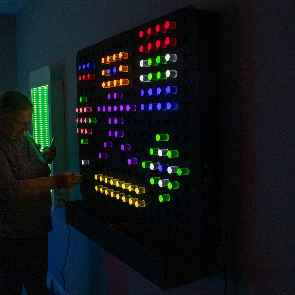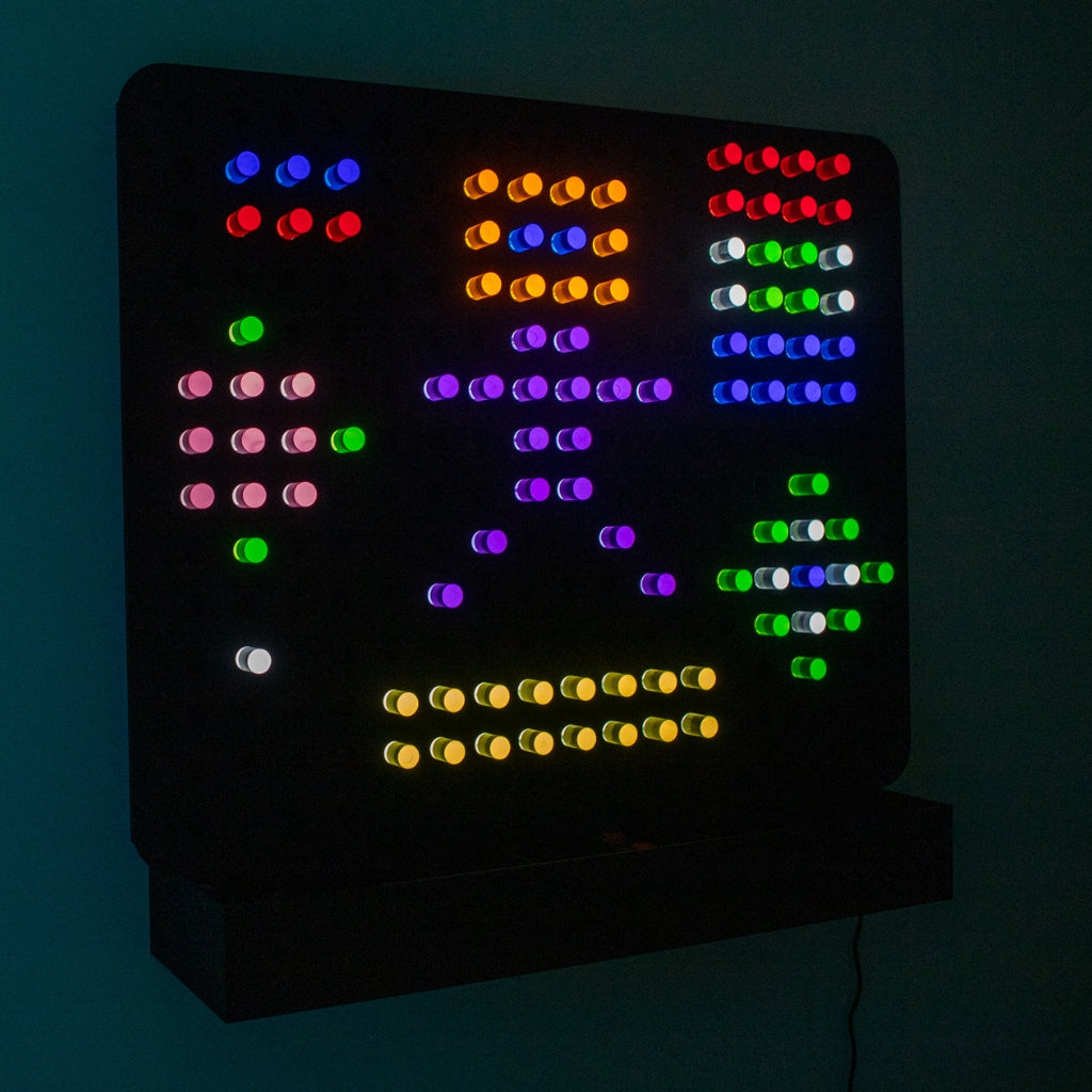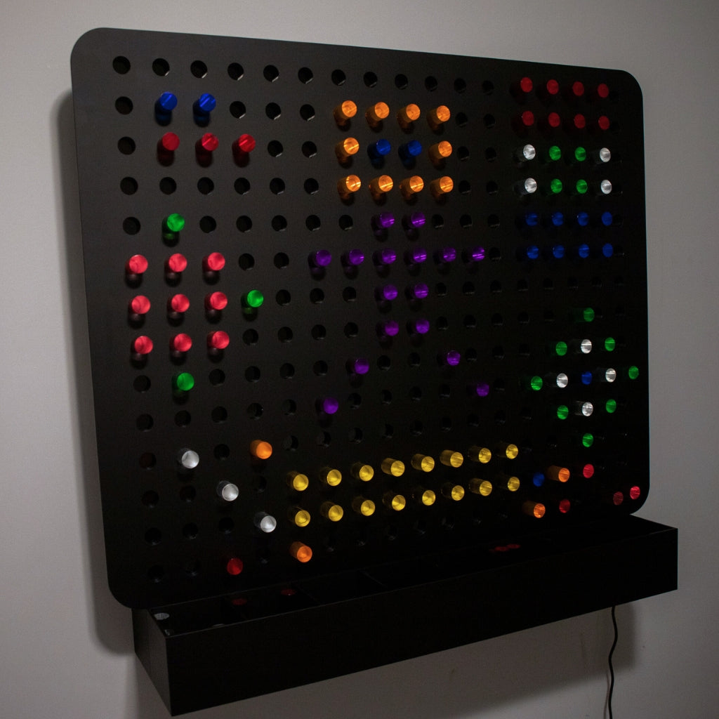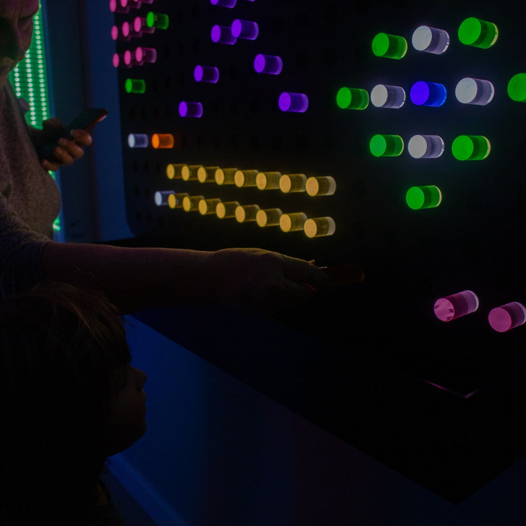 • Large wall-mounted light board with interactive glowing pegs